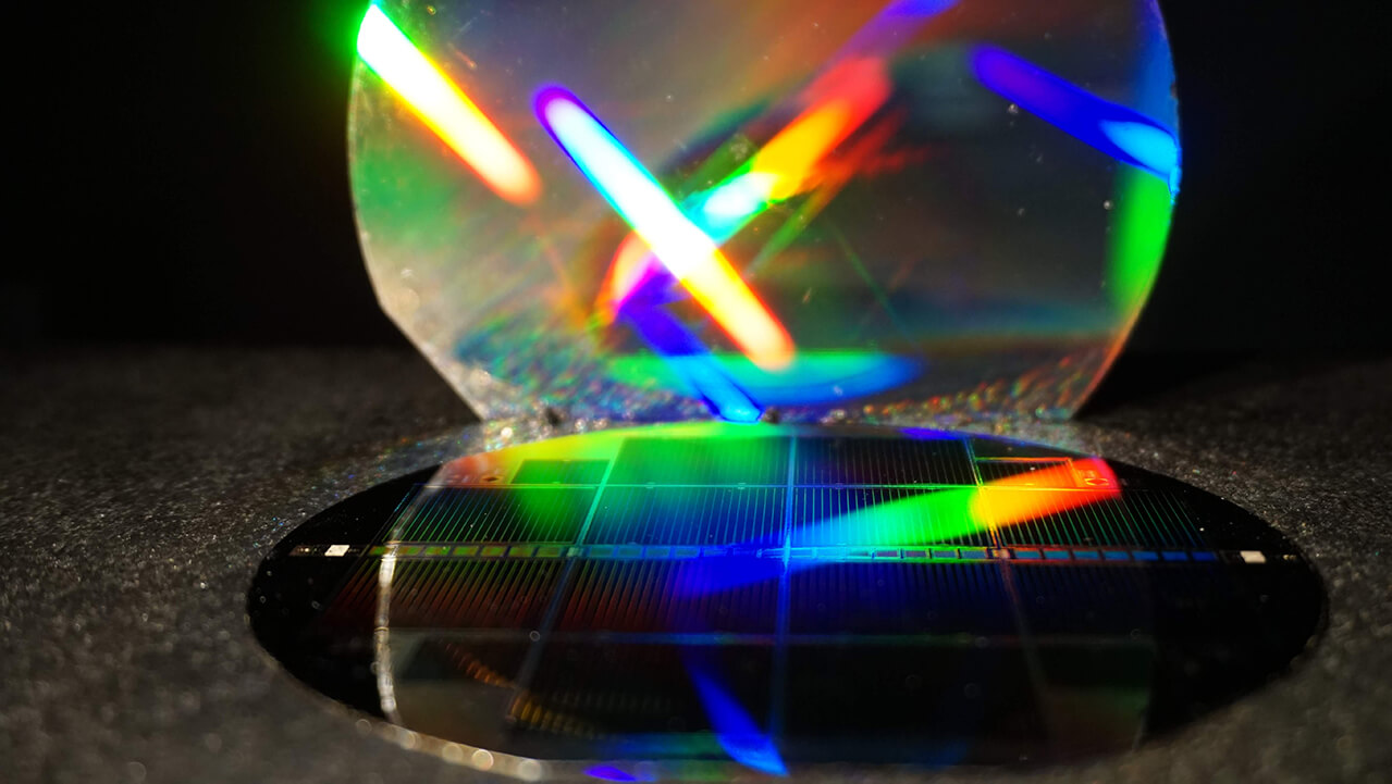 The rainbow colors show the diffraction of sunlight by a mirror with a nanostructured grating, which was applied to the back of the silicon subcell. The sun’s spectrum is thus captured even better in the silicon bottom cell. © Fraunhofer ISE / Photo: Michael SchachtnerFraunhofer Institute for Solar Energy Systems: Tandem Photovoltaics Enables New Heights in Solar Cell Efficiencies – 35.9 % for III-V//Silicon Solar Cell